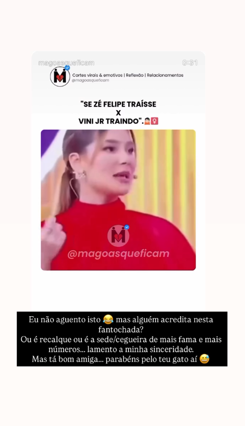 Aliás, a propósito dessa traição, tornou-se viral uma montagem de dois vídeos, cuja protagonista é Virginia Fonseca. No primeiro, mais antigo, a empresária mostra-se determinada a nunca perdoar uma traição de Zé Felipe. Já no outro, mais recente, e após a traição de Vini Jr., Virginia Fonseca mostra-se disponível a dar uma segunda oportunidade.