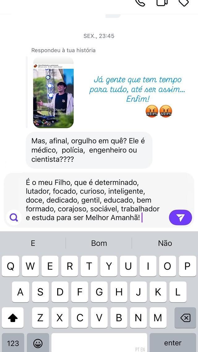 E Fernanda Serrano respondeu à letra: “É o meu filho, que é determinado, lutador, focado, curioso, inteligente, doce, dedicado, gentil, educado, bem formado, corajoso, sociável, trabalhador e estuda para ser melhor!”