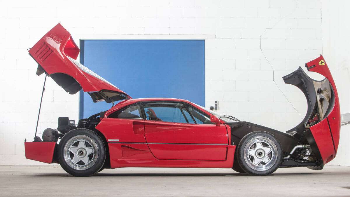 O Ferrari F40 de 1987 com a sua característica abertura dos capots dianteiro e traseiro