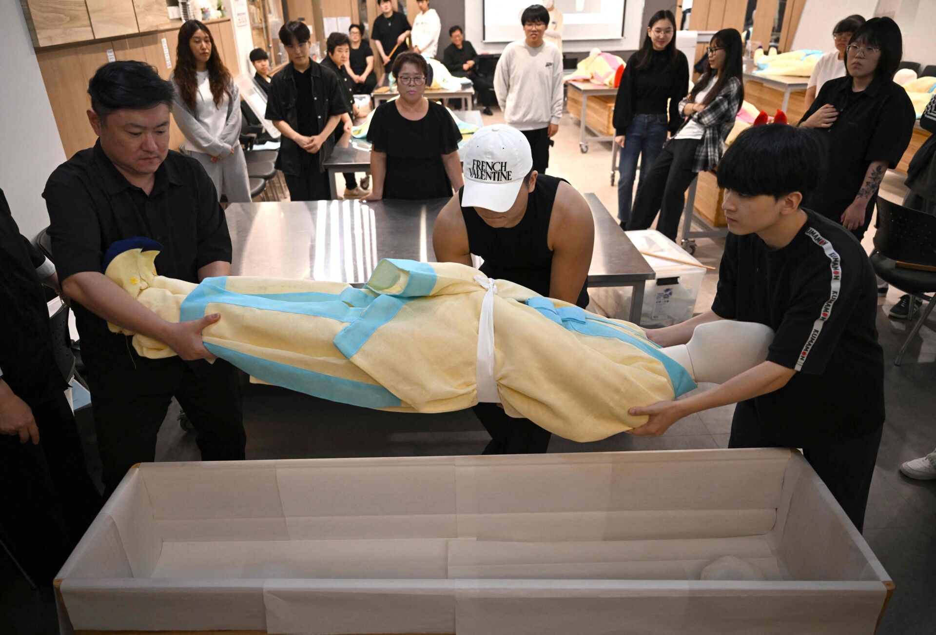 No Instituto de Ciência e Tecnologia, os alunos envolvem delicadamente um manequim em tecidos tradicionais, alisando as dobras como se o falecido fosse real, antes de o colocar com cuidado num caixão. “Com o envelhecimento da nossa sociedade, imaginei que a procura por este tipo de trabalho só aumentaria”, explicou Jang Jin-yeong, um estudante de administração funerária de 27 anos.