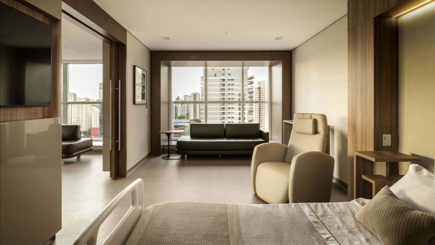 Orçado em R$ 350 milhões, o hospital conta com apenas sete quartos por andar — nos projetos tradicionais, são, em média, 30 por pavimento. As acomodações têm 60 metros quadrados e são equipadas com camas inteligentes, enxovais de algumas centenas de fios e gastronomia assinada por chefs, garantindo a exclusividade e a sofisticação típicas dos hotéis mais estrelados.