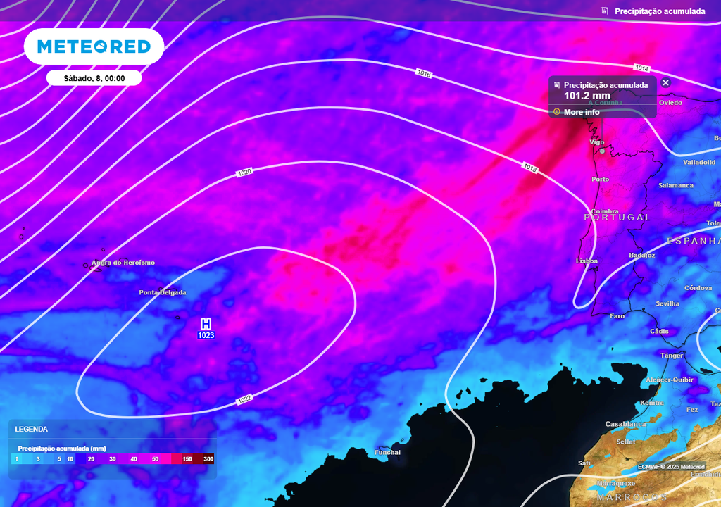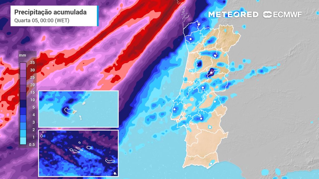 De acordo com os mapas de referência da Meteored, ao final do dia de quarta-feira (5), a precipitação acumulada no Minho poderá rondar os 80 mm, e nos distritos de Porto, Aveiro, Viseu, Coimbra e Guarda – total ou parcialmente – poderá atingir um máximo de 60 mm.