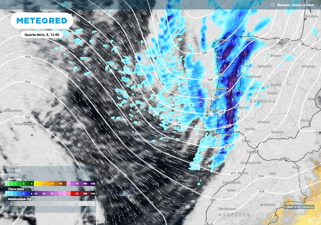 Na quarta-feira (5) a crista anticiclónica já não estará robusta o suficiente para impedir a progressão da frente fria, que avançará de noroeste para sudeste de Portugal continental, gerando chuva em todo o país, embora com maior probabilidade e frequência nas regiões a norte do sistema montanhoso Montejunto-Estrela e sobretudo naquelas que se situam a oeste da Barreira de Condensação. Além disso, será reforçada por um rio de humidade que tornará a precipitação mais forte e persistente.