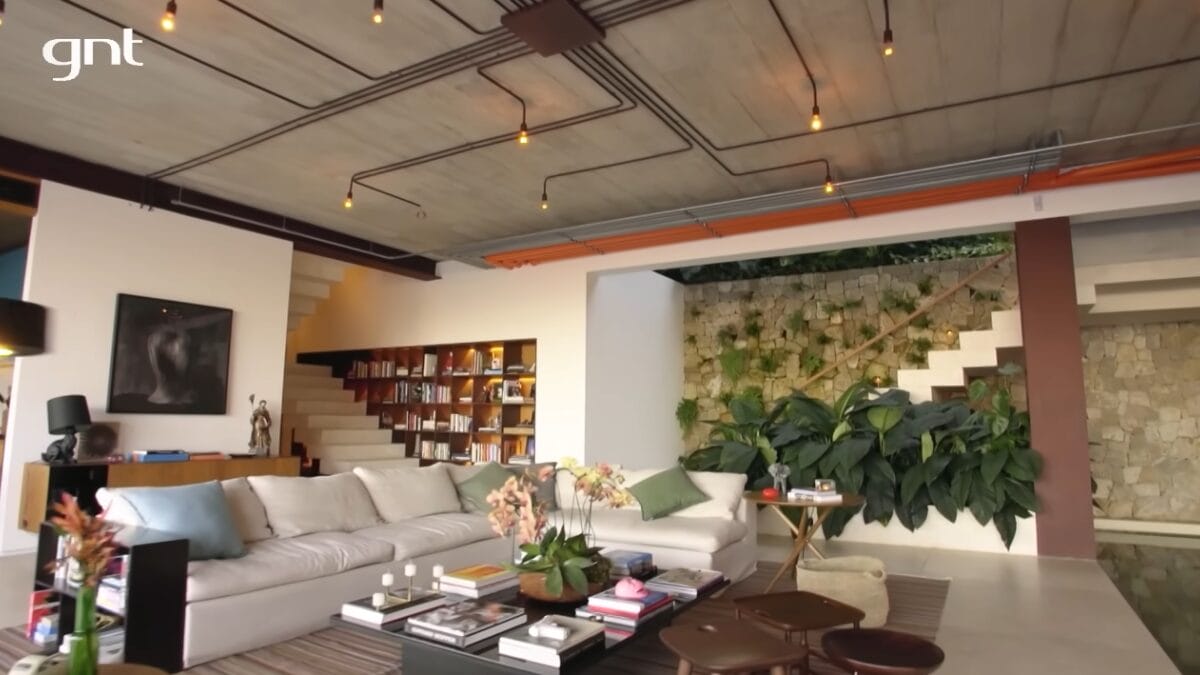 O espaço de Murilo tem espaço otimizado e a arquitetura é pensada para integrar natureza e luz. A casa tem piscina, três andares e uma grande área de lazer no piso inferior, que contava com várias opções de lazer para os filhos, na época que o GNT visitou a residência.