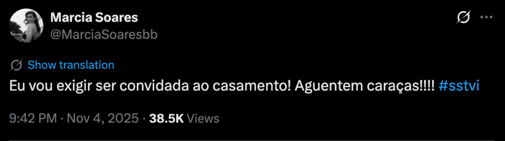 “Eu vou exigir ser convidada ao casamento! Aguentem caraças!!!!”, disse Marcia Soares, que antes do culminar das discussões já tinha deixado um pedido à VOZ para conceder um tempo a sós ao casal.