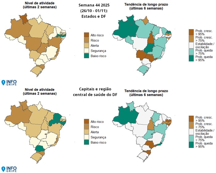 A análise é referente à Semana epidemiológica 44, de 26 de outubro a 1º de novembro. O InfoGripe é uma estratégia do Sistema Único de Saúde (SUS) voltada ao monitoramento de casos de SRAG no país. A iniciativa oferece suporte às vigilâncias em saúde na identificação de locais prioritários para ações, preparações e resposta a eventos em saúde pública.