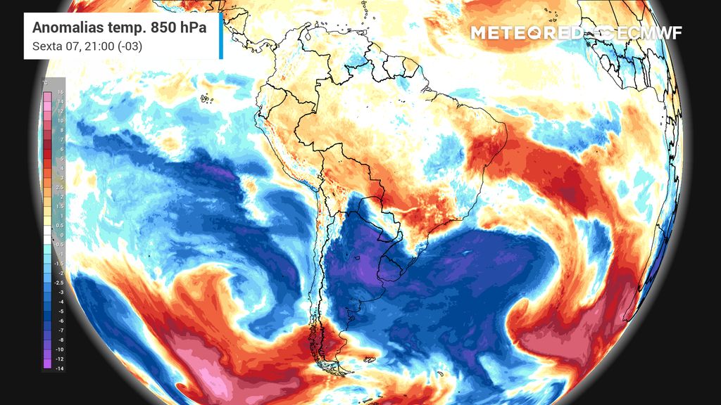 Anomalia de temperatura em 850 hPa na tarde de quinta-feira (6).Anomalia de temperatura em 850 hPa mostra ar frio atuando sobre o RS e leste dos estados do PR, SC, SP e RJ na tarde de quinta-feira (6).