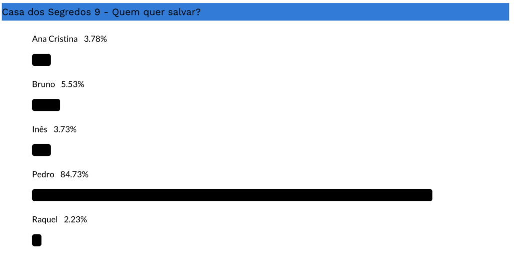 Pedro Jorge destaca-se para salvar com 84,73% dos votos, seguido de Bruno com 5,53% dos votos. Ana Cristina, Inês e Raquel estão muito renhidas com 3,78%, 3,73% e 2,23% dos votos respetivamente.