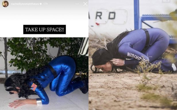 Rachel não apenas se fantasiou como a cantora, mas também debochou da artista ao recriar a icônica cena em que Katy beija o solo após pousar na Terra. “Take up space!” (‘Ocupe o espaço!’), escreveu a atriz.