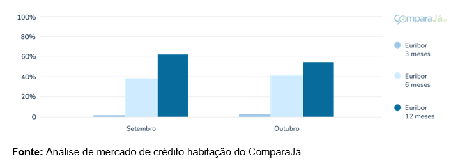 Apesar de a EURIBOR a 12 meses continuar dominante nos contratos, perdeu algum peso em outubro, enquanto a EURIBOR a 6 meses subiu para 42,2%, demonstrando maior confiança dos mutuários na tendência descendente das taxas e incentivando uma reavaliação das opções de financiamento.