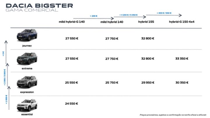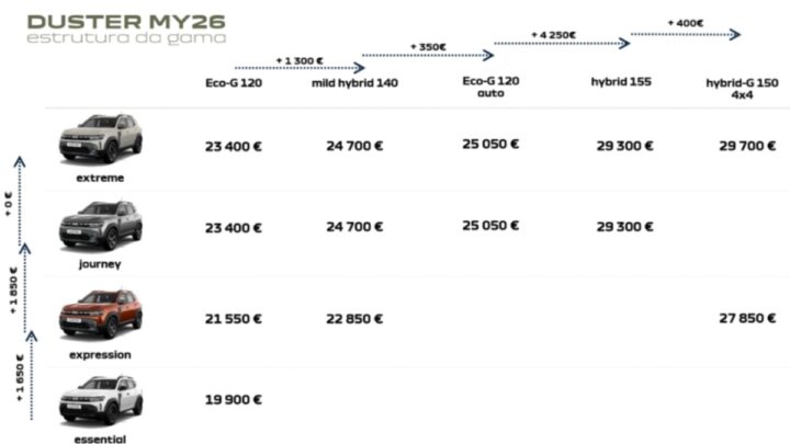 Para complementar o anúncio da abertura das encomendas, a Dacia revelou também a estrutura de preços e versões dos novos Duster e Bigster HYBRID-G 150 4×4, inseridos na gama MY26.