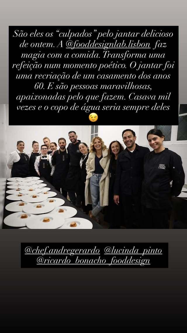 “São eles os ‘culpados’ pelo jantar delicioso de ontem. A Food Design Lab – Lisbon faz magia com a comida. Transforma uma refeição num momento poético”, começou por referir a comunicadora.