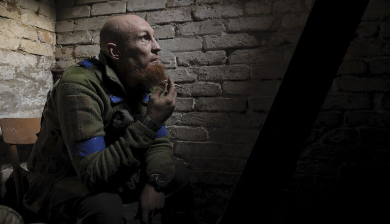 Soldado ucraniano a fumar num abrigo numa posição da linha da frente perto de Chasiv Yar, na região de Donetsk, na Ucrânia.