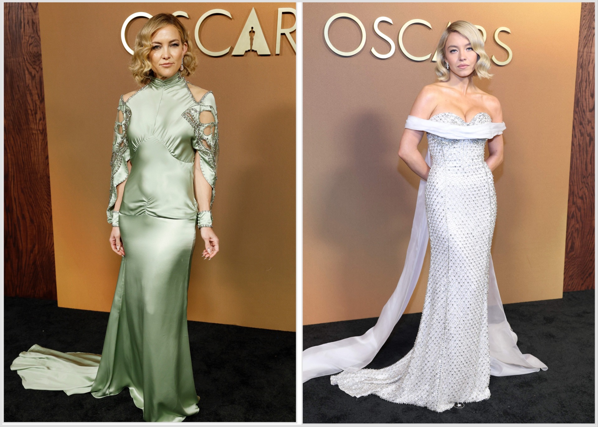 Kate Hudson surgiu com um Valentino de decote halter, mangas de tul e pedraria delicada. Logo depois, Sydney Sweeney deixou a plateia a comentar o brilho quase líquido do seu Miu Miu, totalmente aplicado com pequenos cristais e acompanhado por uma capa que lhe dava movimento.