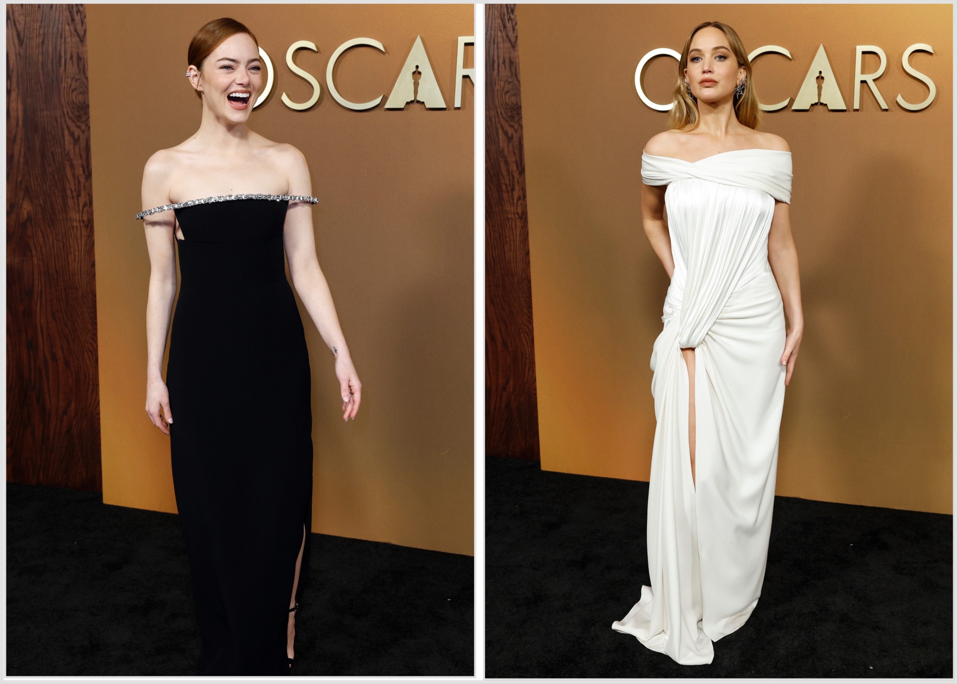 Num registo mais contido, Emma Stone apareceu com um Louis Vuitton de decote Bardot, enquanto o Dior branco escolhido por Jennifer Lawrence, trabalhado em drapeados com uma fenda pronunciada, demonstrou como a simplicidade pode ser igualmente marcante.