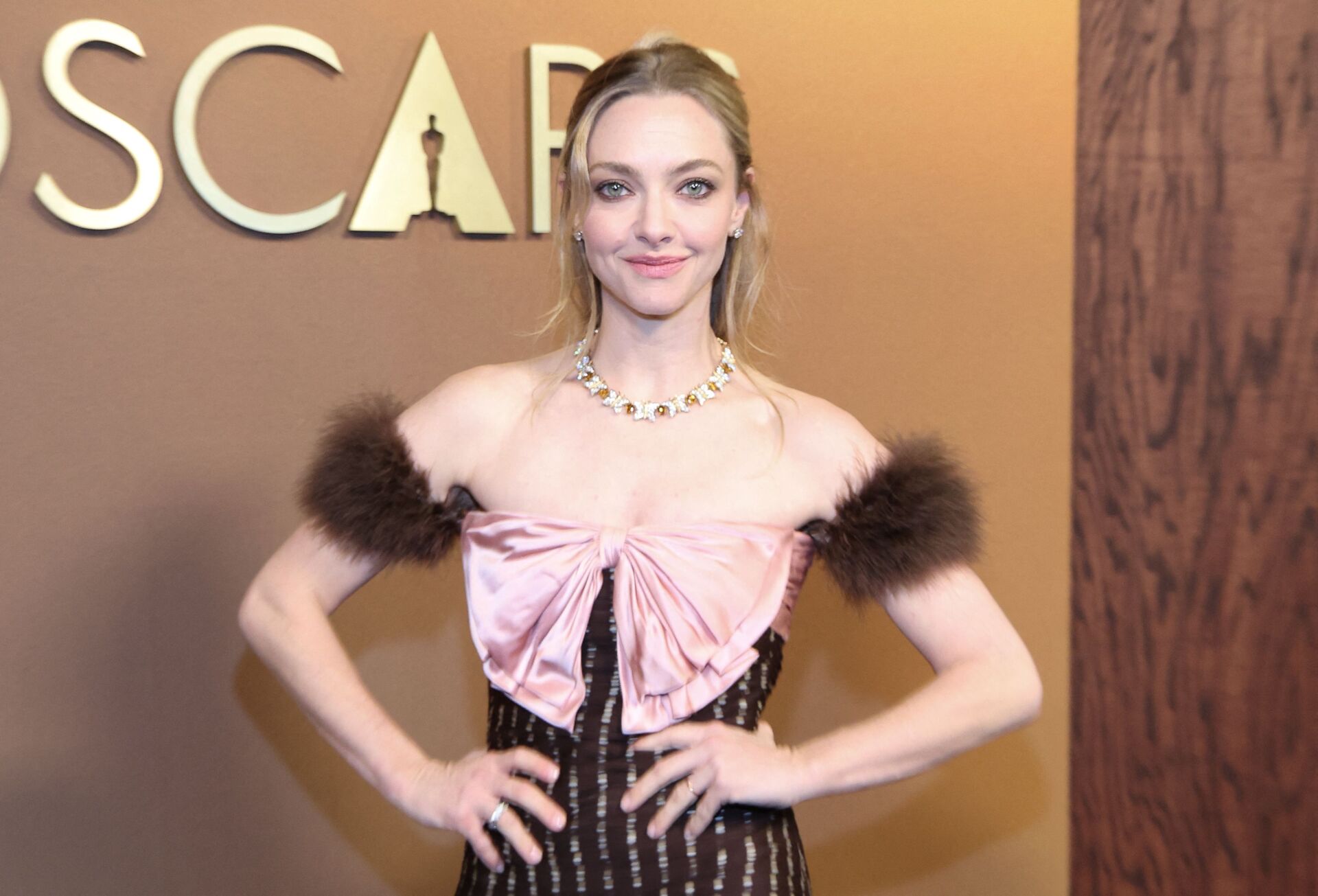 Numa paleta mais suave, Dakota Johnson escolheu um Valentino verde água, enquanto Amanda Seyfried apostou na ousadia controlada de um modelo com padrão às bolas castanho e branco, adornado com um laço rosa frontal e mangas com pelo?
