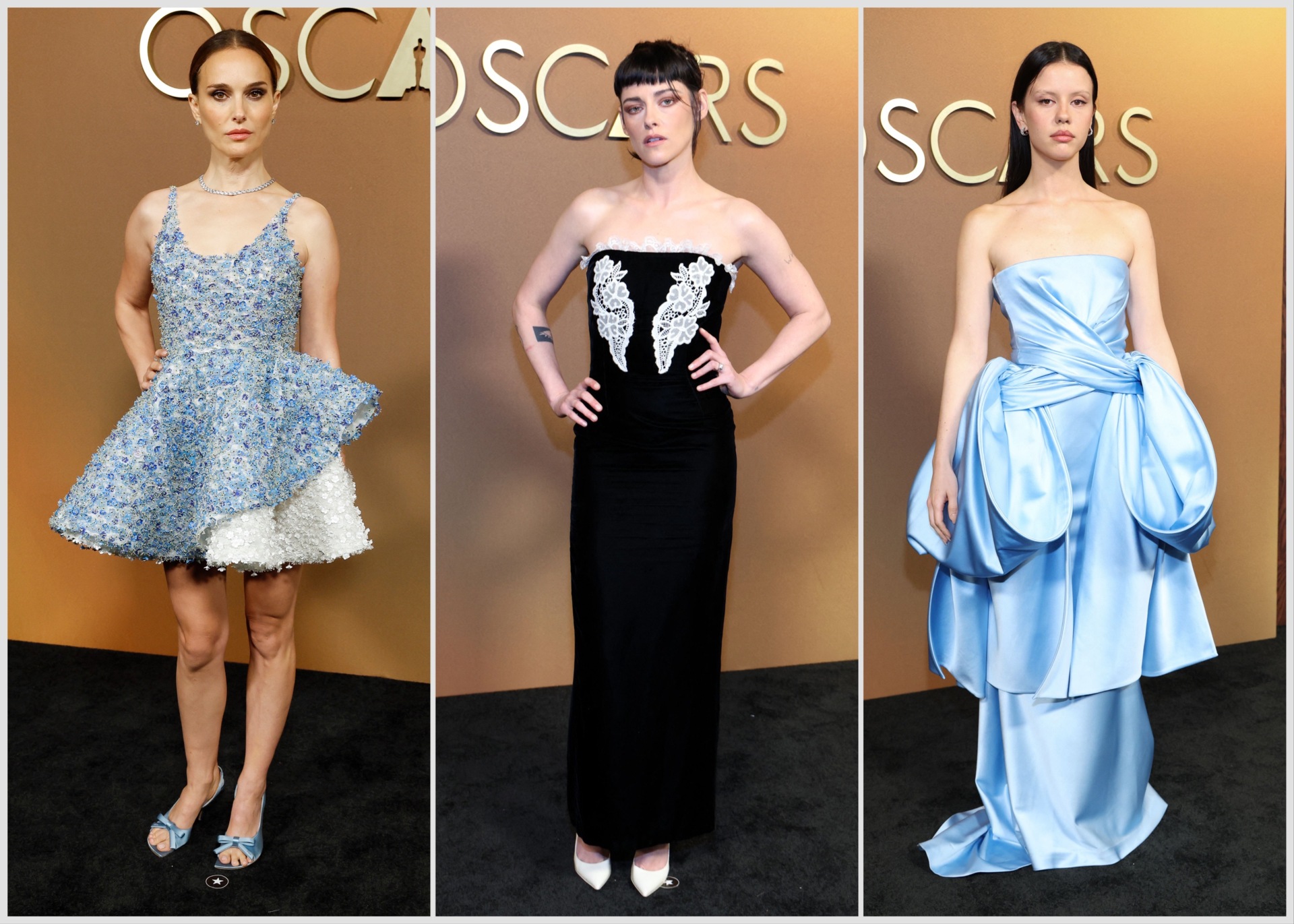 Natalie Portman afastou-se dos comprimentos tradicionais e optou por um Dior de pedraria, estruturado como se fosse uma pequena escultura. Kristen Stewart manteve a linha minimalista com um Rodarte preto, de decote palavra de honra e bordados florais. Mia Goth, igualmente fiel à Dior, escolheu um azul-bebé com dois laços marcantes na anca.