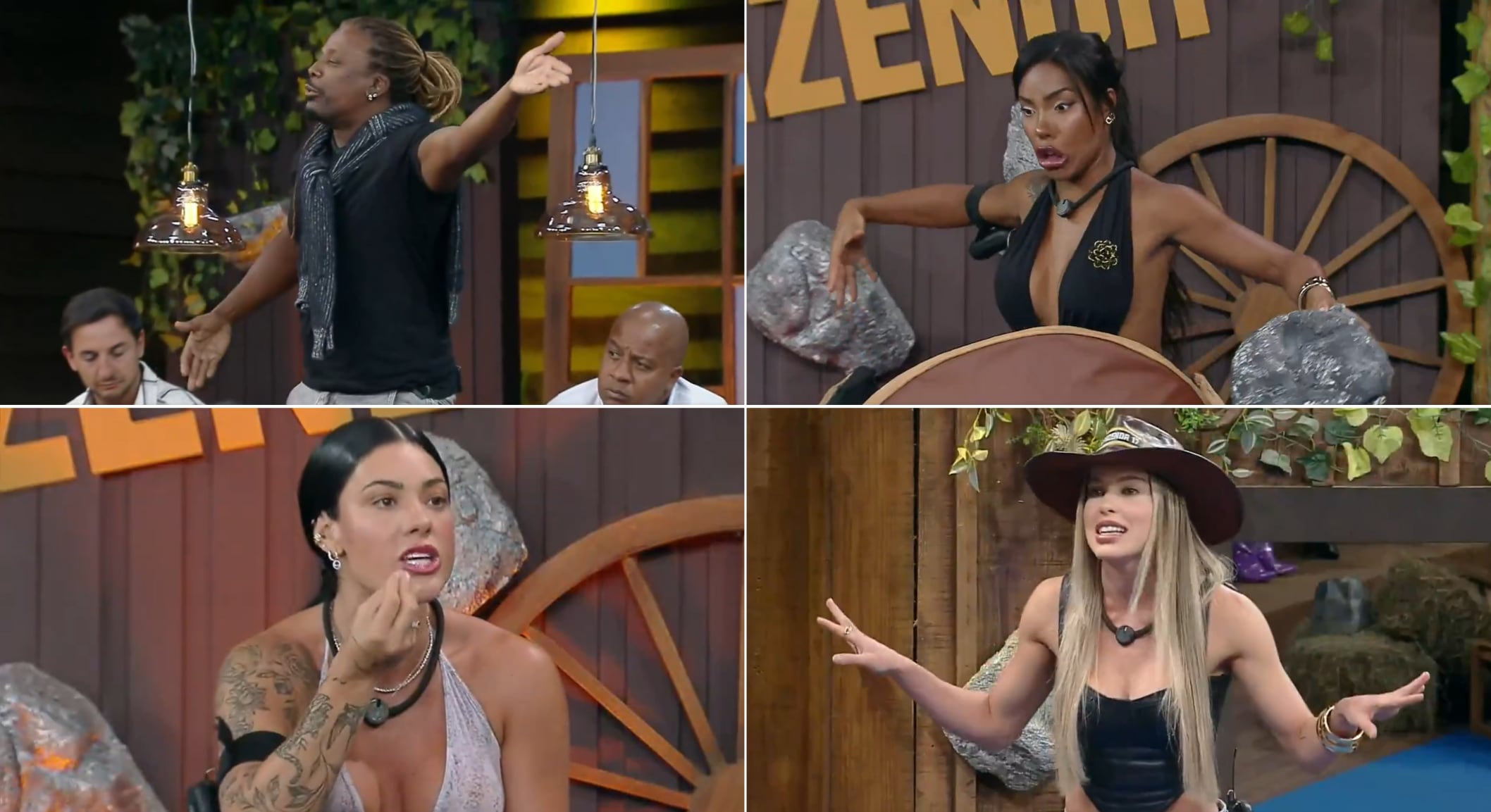 Adriane Galisteu explicou a dinâmica: “Quem começa, claro, é a nossa Fazendeira Saory Cardoso. Ela vai dizer quem na F17 é uma pedra no sapato dela. Depois, a pessoa pega uma pedra, entra na bota e escuta a justificativa. Em seguida, a pedra faz sua réplica.”