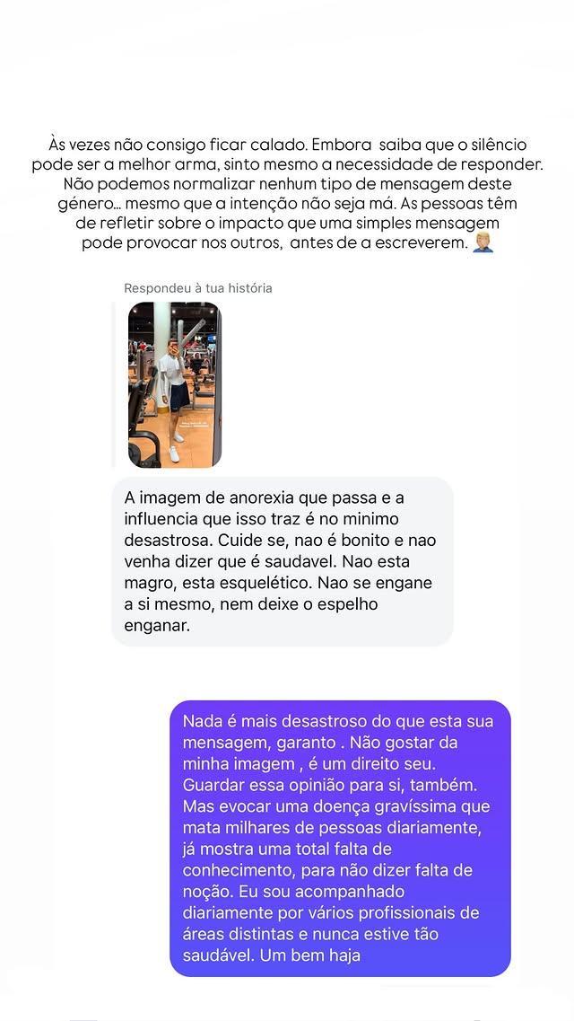 “A imagem de anorexia que passa e a influência que isso traz é, no mínimo, desastrosa. Cuide-se. Não é bonito e não venha dizer que é saudável. Não está magro. Está esquelético. Não se engane a si mesmo. Nem deixe que o espelho o engane”, pode ler-se numa mensagem.