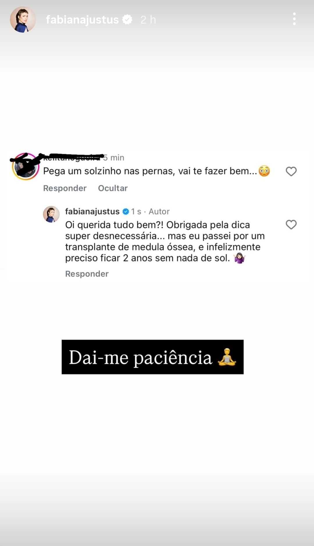 Depois da resposta, Fabiana ainda repostou o print da interação em seus Stories. Na imagem, ela adicionou uma frase curta e direta, deixando clara sua exaustão com comentários desse tipo: “Dai-me paciência”.
