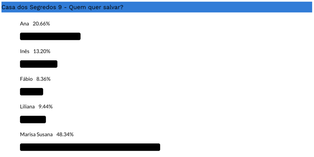Com 48,34% dos votos, Marisa Susana é a concorrente mais votada para salvar, seguida de Ana com 20,66% dos votos e Inês com 13,20% dos votos. Entre os menos votados temos, Fábio e Liliana com 8,36% e 9,44% dos votos, respetivamente.