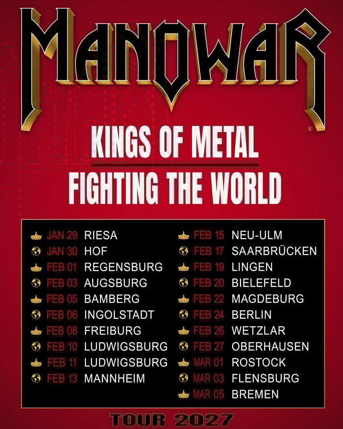 O Manowar anunciou a turnê “Kings of Metal Fighting the World”. Como o título deixa claro, o giro celebra os aniversários de 40 anos dos álbuns “Fighting the World” (1987) e “Kings of Metal” (1988). Os shows terão início em 2027, pela Alemanha. A agenda completa até o momento pode ser conferida na imagem abaixo.