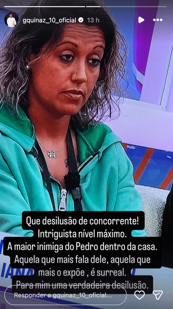 “A maior inimiga do Pedro dentro da casa. Aquela que mais fala dele, aquela que mais o expõe, é surreal. Para mim uma verdadeira desilusão.”, acrescentou ainda Quinaz.