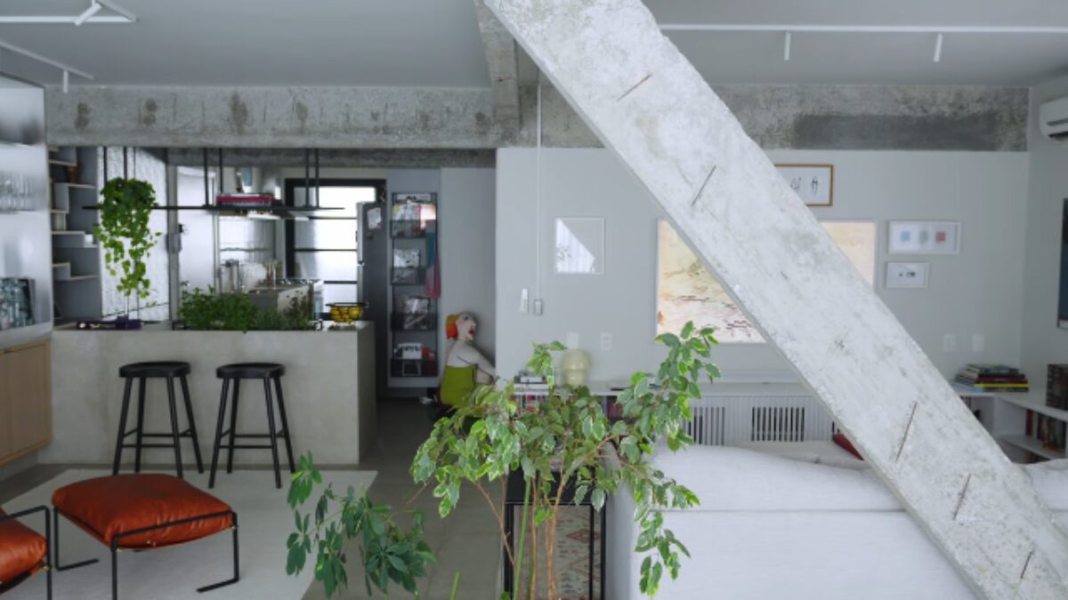 Estilo industrial se vê nas vigas, na pintura e nos materiais utilizados. (Foto: Reprodução, YouTube, Casa e Jardim)