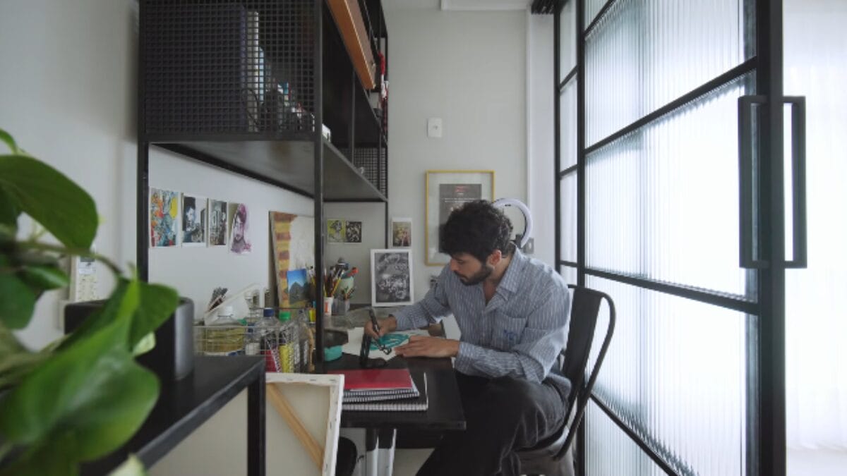Apartamento de Bruno Fagundes tem poucas paredes. (Foto: Reprodução, YouTube, Casa e Jardim)