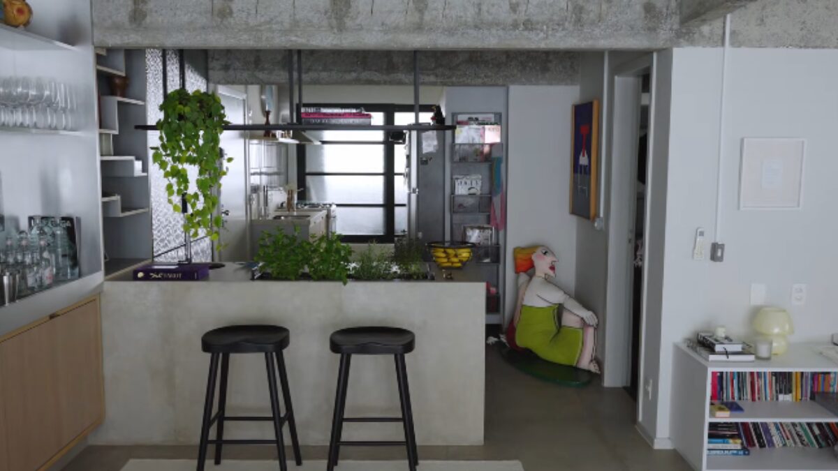 O refúgio de Bruno Fagundes segue o estilo industrial, com decoração composta por muitos objetos que ajudam a contar a história dele. Detalhes como o bar, a horta em cima da pia e os objetos afetivos na decoração chamam atenção.