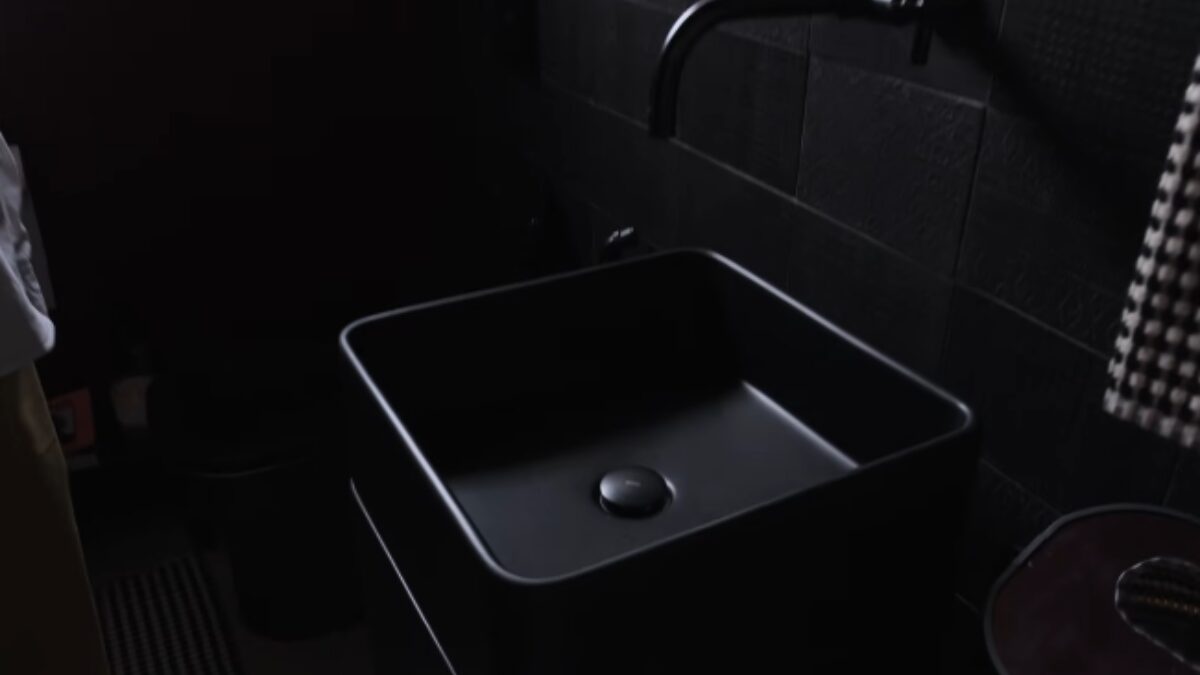 Lavabo é todo escuro. (Foto: Reprodução, YouTube, Casa e Jardim)