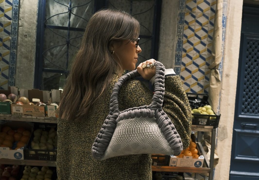 O primeiro desenho nasce do contraste da napa, disponível em várias cores e padrões, com acabamento em croché na alça e nas bordas. Apesar da variedade, Madalena apostou apenas em tonalidades neutras como o castanho, o preto ou o cinza.