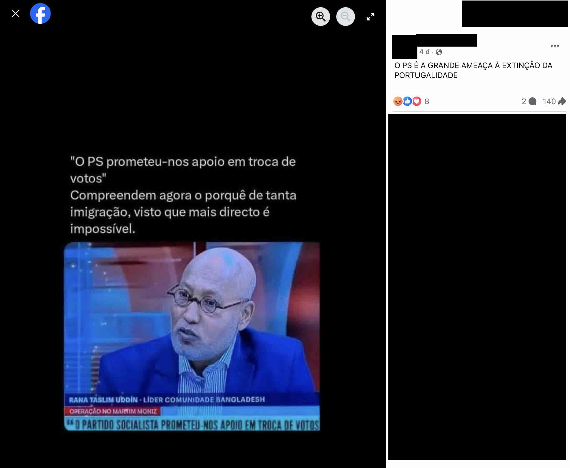 “Vale tudo para o PS ter votos e não interessa como, o que interessa é estar no poder para sempre”, comenta-se numa das publicações que mostra a imagem supostamente captada a partir de uma entrevista de Rana Taslim Uddin, líder da comunidade do Bangladesh em Lisboa, nos estúdios da SIC Notícias, com a seguinte citação em destaque: “O Partido Socialista prometeu-nos apoio em troca de votos.”
