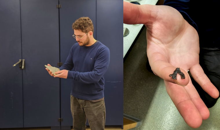 À esq., pesquisador Bruno Becker-Kerber segura amostra de rocha onde fóssil foi encontrado. À dir., o fóssil no formato em que habitou a Terra (foto: acervo pessoal)