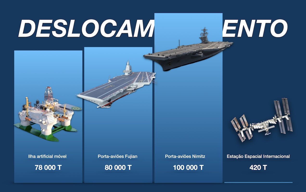 Comparação do deslocamento da ilha artificial com o provocado pelos porta-aviões Fijian e USS Nimitz e a Estação Espacial Internacional