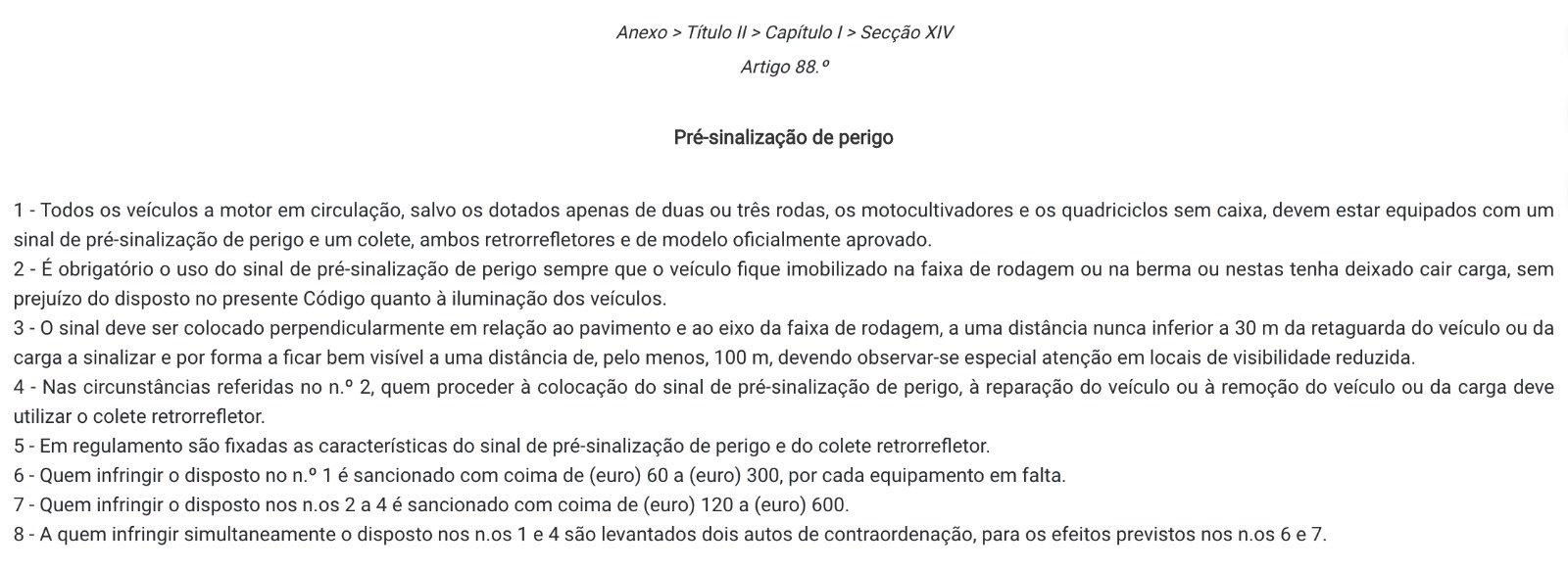 Este artigo indica que “todos os veículos a motor em circulação, salvo os dotados apenas de duas ou três rodas, os motocultivadores e os quadriciclos sem caixa, devem estar equipados com um sinal de pré-sinalização de perigo e um colete, ambos retrorrefletores e de modelo oficialmente aprovado”. O uso deste sinal de pré-sinalização de perigo – o triângulo – é de uso “obrigatório”, como se indica no ponto 2 do mesmo artigo, “sempre que o veículo fique imobilizado na faixa de rodagem ou na berma ou nestas tenha deixado cair carga”.
