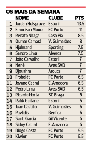 Menção para a entrada no top ten de Froholdt (ao apontar o golo do êxito portista o dinamarquês subiu ao 8.º lugar e é 2.º dos médios atrás de Luís Esteves) e do guardião gilista Andrew (saltou para a 9.ª posição e passou a liderar o sector ao defender um penálti nas Aves, o segundo castigo que pára nesta edição e este garantiu um ponto aos galos).