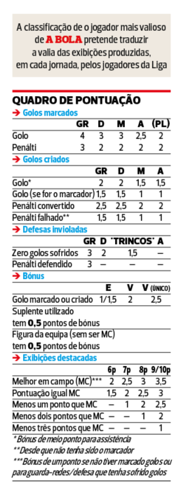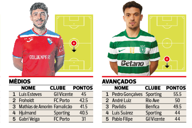 Do alto dos seus 1,73m Pedro Gonçalves respondeu de cabeça a um bom cruzamento de Geny Catamo para empatar o jogo em Ponta Delgada — partida que não acabaria face a nova lesão muscular na coxa direita — e ao alcançar o seu oitavo golo no campeonato (2.º melhor marcador após Pavlidis, que tem nove) manteve-se no topo da classificação de O jogador mais valioso de A BOLA da Liga. Pote é agora perseguido por Sidny Cabral que, mais uma vez irrepreensível da marca dos 11 metros, empatou o jogo na Reboleira frente ao Nacional e ultrapassou o rioavista André Luiz, que passou por Alverca sem grande destaque.