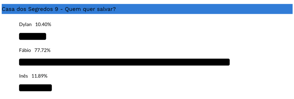 Com 77,72% dos votos, Fábio é o concorrente mais votado para salvar. Dylan e Inês estão numa ‘disputa’ renhida com 10,40% e 11,89% dos votos, respetivamente.