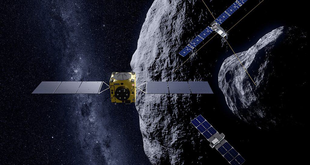 Representação artística da espaçonave Hera, da Agência Espacial Europeia (ESA), lançaa para estudar o asteroide atingido pela missão DART, da NASA, em 2022. Crédito: ESA/Gabinete de Ciência