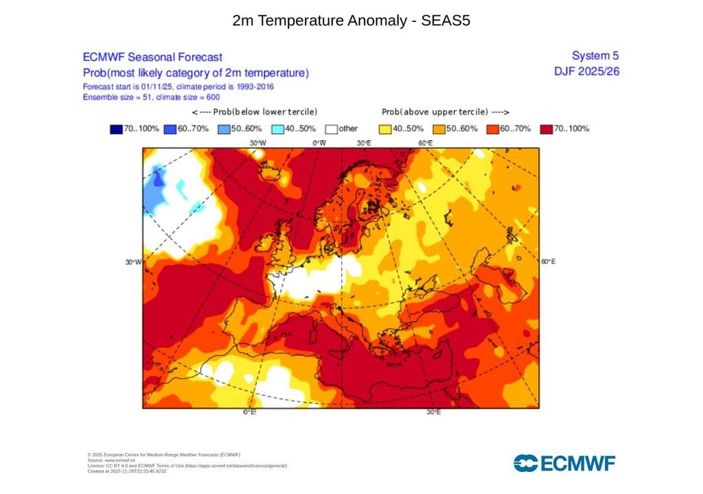 No que diz respeito às anomalias térmicas, é muito provável que as temperaturas se situem acima da média trimestral em todo o país, especialmente no Algarve e nos arquipélagos dos Açores e da Madeira. Esta situação poderá estender-se ao resto da Europa, com maior incerteza em várias regiões do centro do continente.
