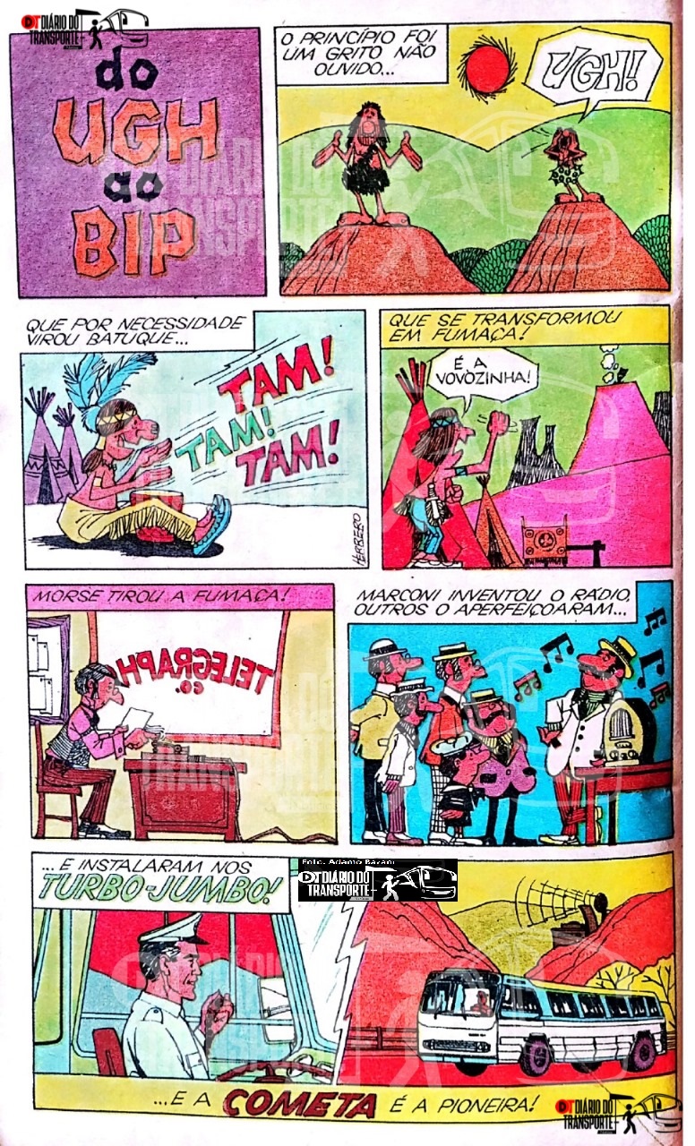 A historinha chama do “UGH ao BIP”. Os quadrinhos começam com homens da pré-história conversando aos gritos, passam pelo tambor, mensagens de fumaça (até com uma piadinha), telégrafo, o rádio e a música, até o rádio chegar ao Turbo-Jumbo.