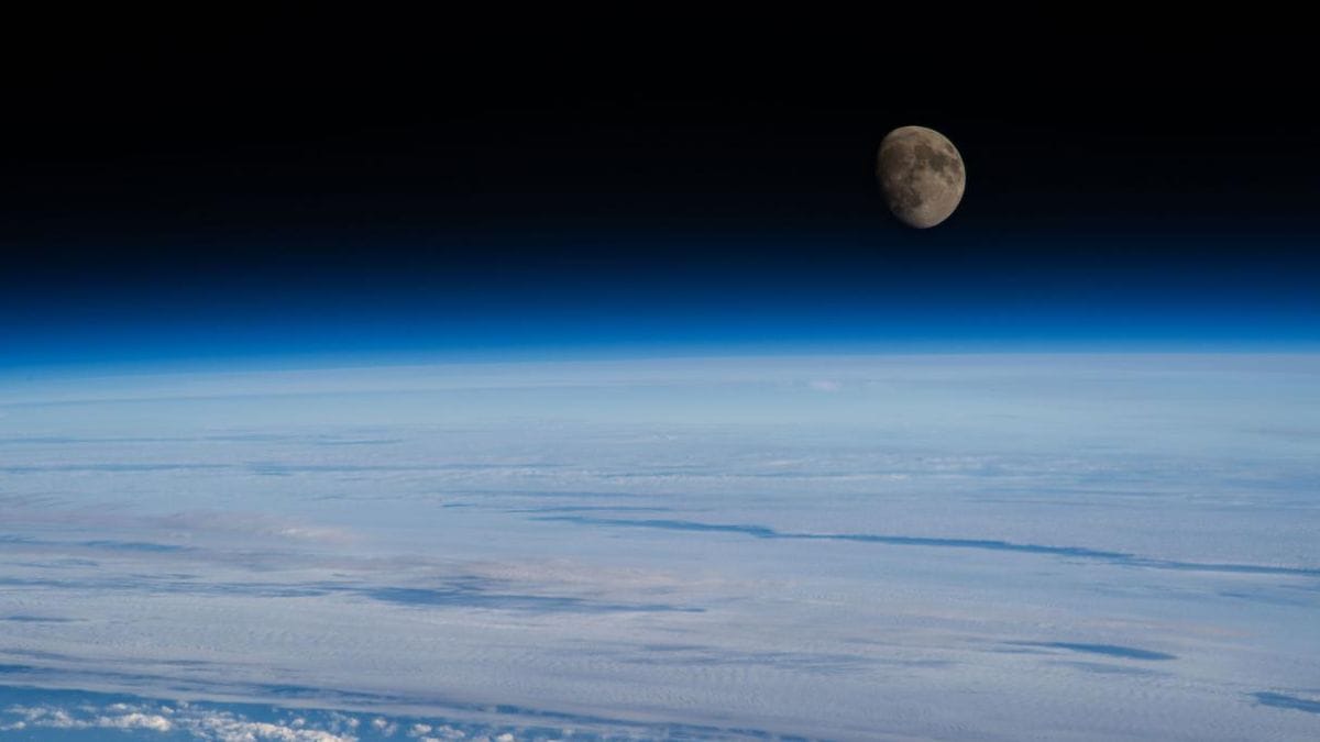 Superfície e atmosfera terrestre , e a Lua ao fundo (Foto: NASA, divulgação)