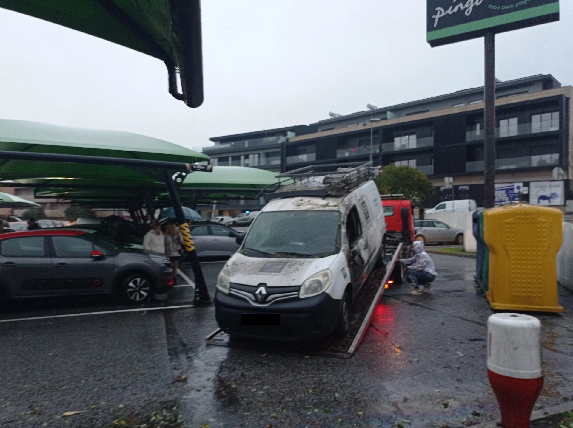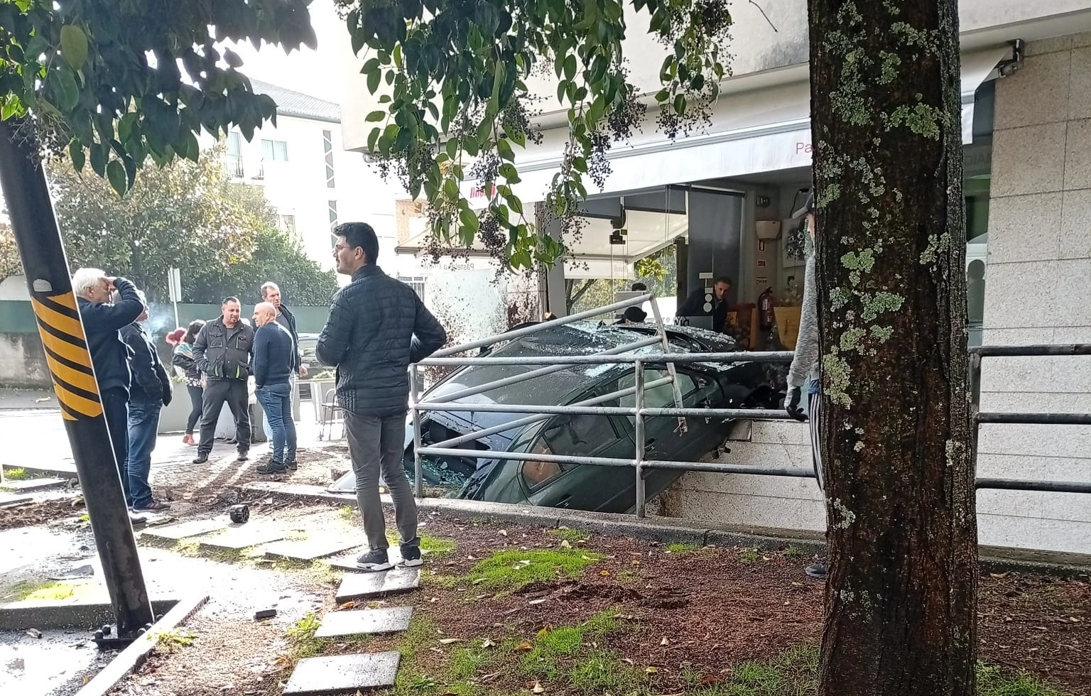 O carro, com a condutora presa no interior, ficou pendurado, metade dentro do estabelecimento e o resto suspenso sobre a rampa da garagem do prédio. A curva onde aconteceu o acidente, no sentido descendente da rua dos Aliados, junto ao supermercado Pingo Doce, é conhecida por ser um local de sinistralidade.