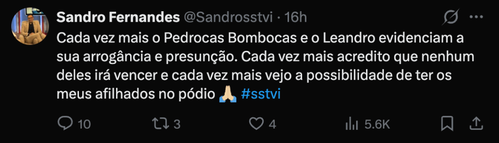 Sandro acredita que Leandro e Pedro estão a perder-se no jogo: “Cada vez mais o Pedrocas Bombocas e o Leandro evidenciam a sua arrogância e presunção. Cada vez mais acredito que nenhum deles irá vencer e cada vez mais vejo a possibilidade de ter os meus afilhados no pódio”.