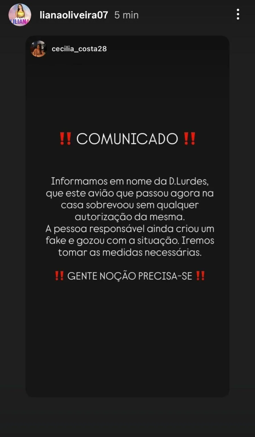Por sua vez, a família de Liliana também se manifestou: «Informamos em nome da D. Lurdes que este avião que passou agora na casa sobrevoou sem qualquer autorização da mesma. A pessoa responsável ainda criou um fake e gozou com a situação. Iremos tomar as medidas necessárias. Gente, noção precisa-se.»
