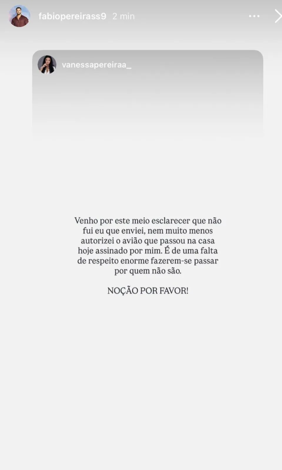 Pouco depois, a irmã de Fábio recorreu às redes sociais para negar que tinha enviado aquele avião. «Venho por este meio esclarecer que não fui eu que enviei, nem muito menos autorizei o avião que passou na casa hoje assinado por mim. É de uma falta de respeito enorme fazerem-se passar por quem não são. Noção, por favor!», escreveu Vanessa.