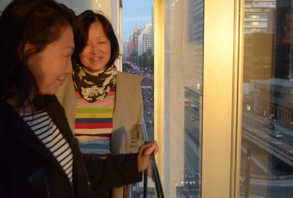 A presença daquele clã de grafiteiras era vista sob duas camadas de estranhamento. “Uma por a gente ser menina; outra por a gente ser oriental”, diz Carmen. Isso não necessariamente era um problema. “Às vezes a polícia passava, mas olhava duas japonesinhas e deixava pra lá”, conta ela. No máximo, lhes diziam: “Recolham suas coisas e vão embora”. A dupla nunca sofreu nenhum tipo de violência, a não ser em Salvador, onde moradores incomodados com uma grafitagem jogaram latas na direção delas. E na turma do grafite, como era relação com as duas meninas do grupo?