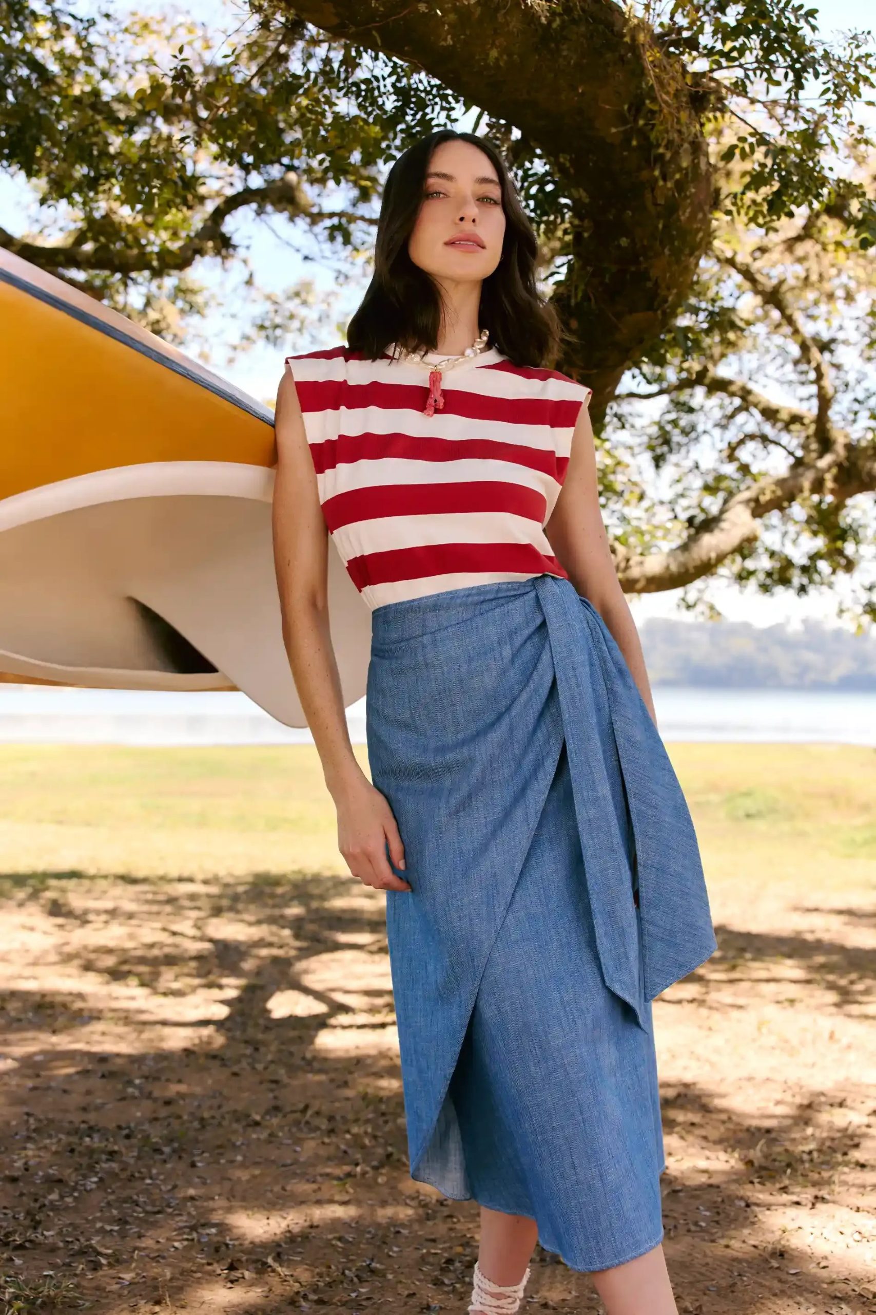 Saia Midi Jeans com Transpasse Frontal da Damyller (R$ 399)