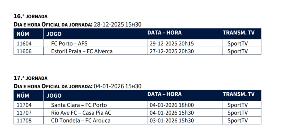 A Liga Portugal emitiu um comunicado oficial a dar conta da alteração da data e hora de jogos das jornadas 16 e 17 da Primeira Liga. Entre eles, está o FC Porto x AVS SAD, que será agora no dia 29 de dezembro pelas 20h15.